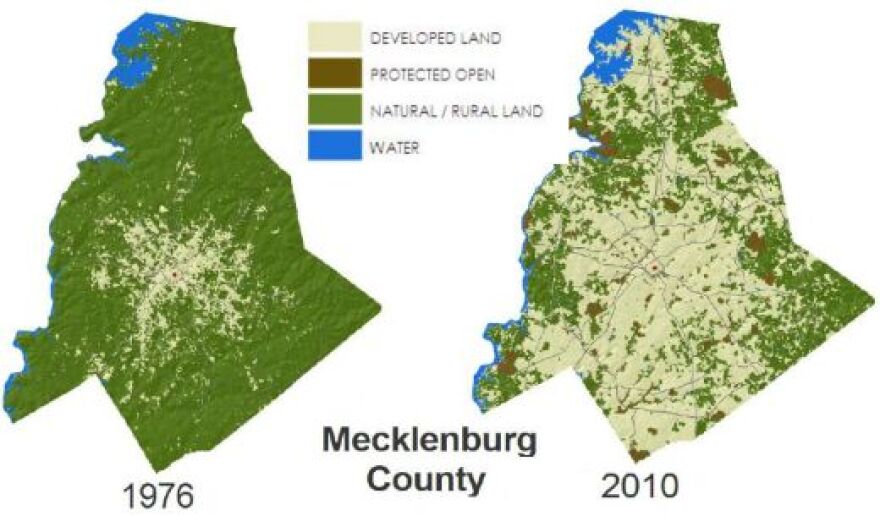 Images Courtesy RENCI at UNC Charlotte. See more here. Conserving Lands In A Challenged Economy According to the North Carolina Department of Environment and Natural Resources, our state leads the nation in lost farm and forest lands - more than a million acres in 10 years. Conservationists around the state are working to change that trend, including preserving lands right here in the Piedmont, where our high projected population growth will make conservation difficult. Plans are in operation to preserve 50,000 acres by 2030, and there are there are opportunities to purchase local natural lands in the current real estate market at a low price. We'll talk with Catawba Lands Conservancy representatives about what they and others are doing to save land in our region. Guests Ann Browning - Interim Executive Director of the Catawba Lands Conservancy and Carolina Thread Trail Project Director Phil Kuttner - Member of the Board of Directors at the Catawba Lands Conservancy, and also CEO of Little Diversified Architectural Consulting Eddie Poe - Member of the Board of Directors at the Catawba Lands Conservancy and also Partner at Parker Poe Adams & Bernstein LLP Add and read comments Pictures | Land analysis in Mecklenburg and other counties from 1976 to projections in 2030