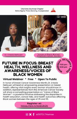 In honor of Breast Cancer Awareness Month, Dr. Erkeda DeRouen will lead an empowering presentation on breast health, offering vital insights every woman should know. In addition, representatives from the American Cancer Society will share a compelling presentation on "Voices of Black Women"-a powerful initiative addressing the disparities in health education, cancer risks, and health outcomes affecting Black women between the ages of 25 and 55.