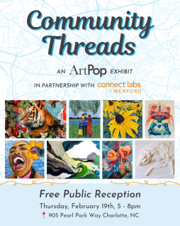 ArtPop is excited to present a new gallery exhibition in partnership with Connect Labs Charlotte. This exhibit aims to inspire innovation, and a positive outlook on human health, nature and beauty. Works by over 30 local artists will convey creativity and optimism to this innovational lab space within The Pearl. The exhibit will be open to the public on Thursday, February 19th, from 5-8pm, with a free reception.