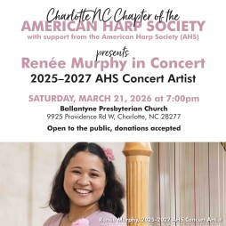 Renée Murphy is the 2025-2027 American Harp Society Concert Artist. She has a beautiful program of harp music to share with us! The concert is free, with donations gladly accepted. The AHS is proud to support Renée's concert in Charlotte.