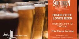 A night of history and beer! Did you know there are over 75 breweries in Charlotte? Join the Levine Museum for a historical discussion all about how Charlotte became a brewery center featuring Daniel Hartis, author of Charlotte Beer: A History of Brewing in the Queen City. Enjoy a curated beer tasting and participate in themed trivia!
