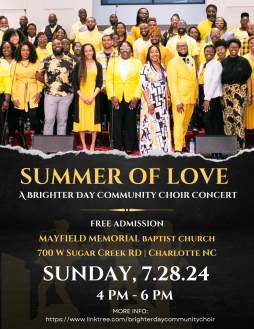 The Brighter Day Community Choir of Charlotte will present our summer 2024 concert, "Summer of Love" - an expression of love, admiration and respect for God, Christ and each other. We invite you to come out and be blessed in an evening of praise, worship, fun and fellowship! Admission is free and open to the public. And bring a friend!