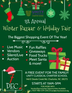 The 1st Annual Winter Bazaar and Holiday Fair is a festive community event designed to celebrate the holiday season while supporting the educational programs at Unity Classical Charter School. The event will bring together families, local artisans, vendors, and community members for a day of holiday shopping, entertainment, and family friendly activities.