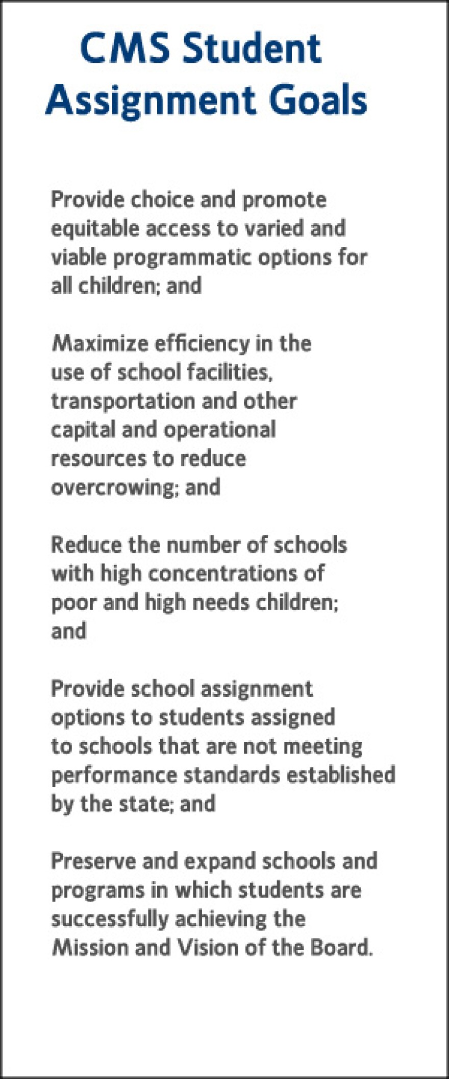 CMS board members finally have goals to help guide the student assignment process. They aren’t much different than the ones they drafted last month. The goals include reducing concentrations of poverty in schools.