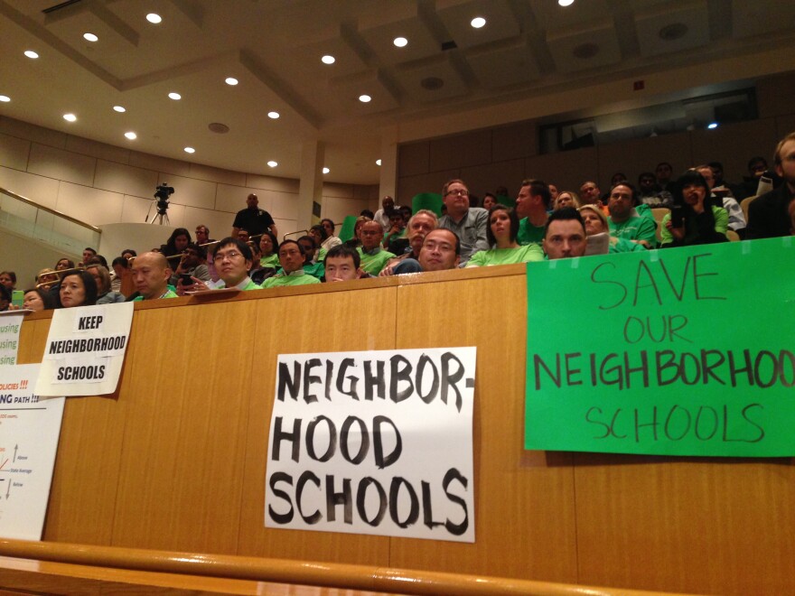 To allay that fear, board member Rhonda Lennon said the goals need to include a guaranteed seat in a school close to home. Many in the audience applauded. Their signs read “Save Our Neighborhood Schools” and “No Forced Busing.”