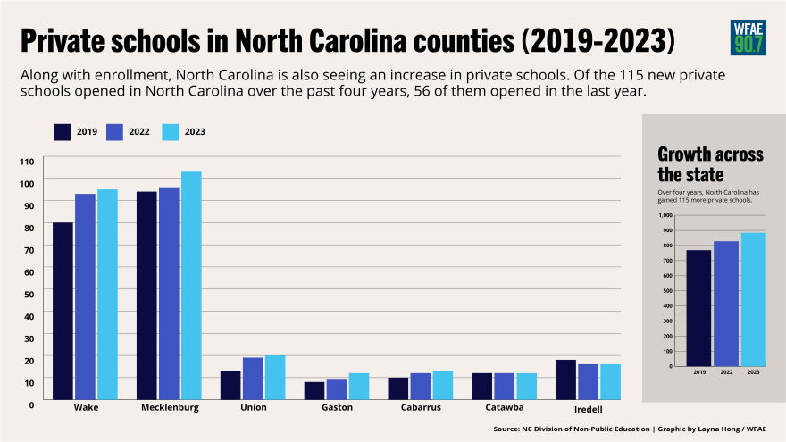 Last year, the state had 126,768 students enrolled in 884 private schools. The annual tally of private schools shows North Carolina has added 115 schools over the past four years — 56 of them just last year. Enrollment is up 24% over the past four years.