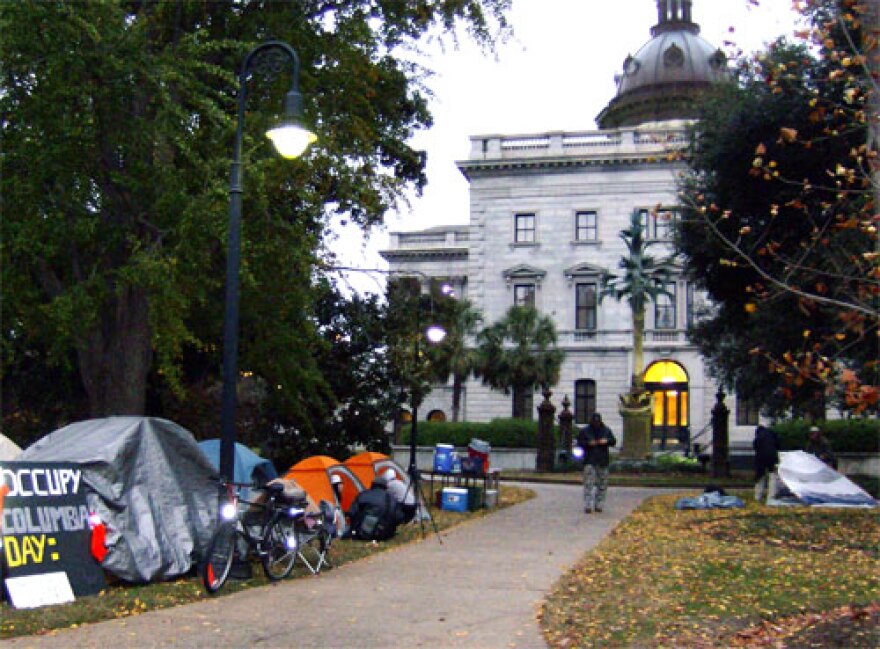 Protesters on lawn of South Carolina Statehouse. Protesters in the Occupy movement will be in a Columbia courtroom Thursday morning arguing that it's their First Amendment right to camp out on the South Carolina statehouse lawn. Governor Nikki Haley has vowed to fight them. You need permission to be on South Carolina's statehouse grounds after 6 p.m., which the Occupy Columbia protesters and their dozen-or-so tents certainly don't have. But when Governor Nikki Haley ordered 19 of them arrested for trespassing a week and a half ago, the protesters sued. They argue the arrests violate their constitutional right to free speech and assembly. A judge said the protesters may have a point and allowed them to keep camping on statehouse grounds until the case could be heard in court on December 1. Governor Haley is none-to-pleased. "We don't allow homeless people to so much as lay down on a bench," said Haley at a press conference on Monday. "We can't go and allow a group to just break the rules like that. And what is unfortunate is now you have a judge that is not only saying 'Don't follow the rules, doesn't matter about the laws, oh and by the way bring your tents and pitch them up.' It's wrong and we're gonna fight it every step of the way." Occupy Columbia protester Shaw Mitchell says the only reason homeless people weren't allowed to sleep on statehouse grounds is "because they didn't have lawyers." "We have lawyers and we believe the First Amendment is our permit for being on this public space," says Mitchell. Governor Haley says the protesters are an eyesore, damage the statehouse lawn and use the flowerbeds as a toilet. She says the protest has cost more than $17,000 in police overtime. Mitchell says the governor has provided no proof of her allegations and adds the campers are moving their tents daily to keep from damaging the grass. The case will be heard at 9 a.m. Thursday by Richland County Judge Alison Lee.